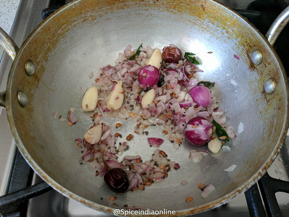 Add in chopped onion, sambar onions and garlic to it and fry till slightly translucent.
