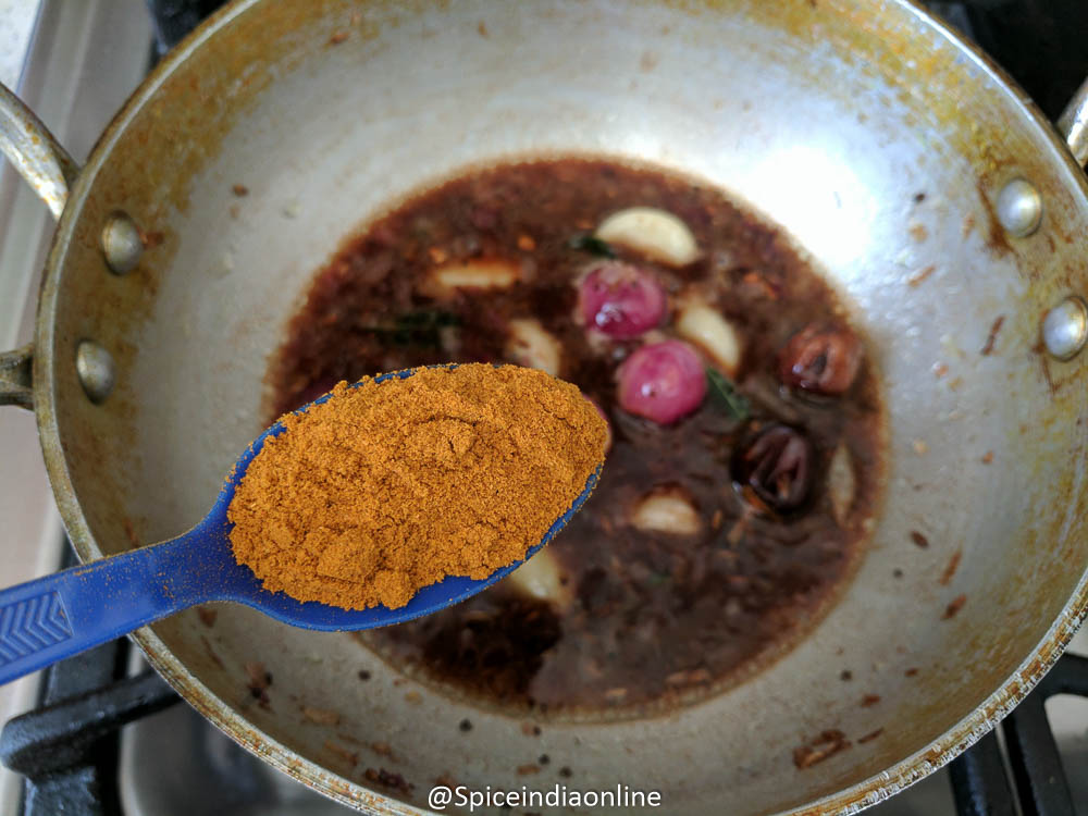 Add in the sambar powder or kuzhambu podi or vatha kuzhambu podi- You may use homemade sambar podi or kuzhambu milagai podi or vatha kuzhambu podi – store bought is fine too. I’ve tried Achi brand, MTR brand & Sakthi masala brand… they are all good. My fav is Sakthi Masala Vatha kuzhambu podi