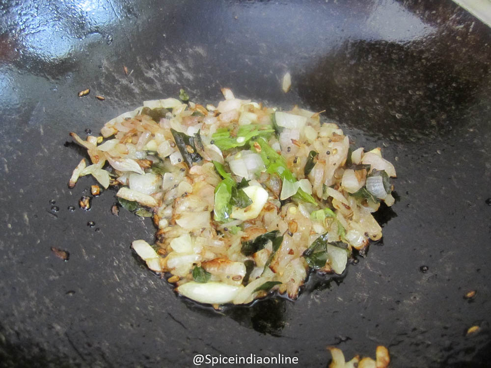Heat oil in a kadai, temper with mustard seeds, cumin, fennel seeds and curry leaves. Add in chopped garlic, onion and slit open green chili. Fry them till lightly browned.