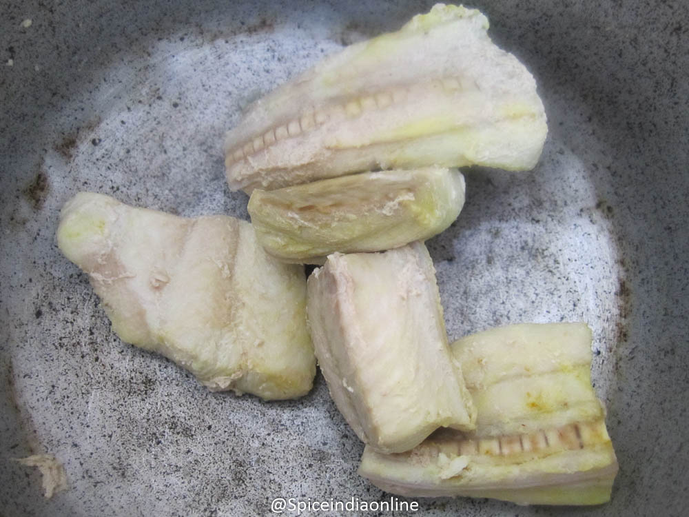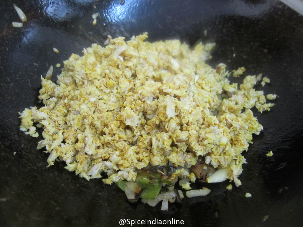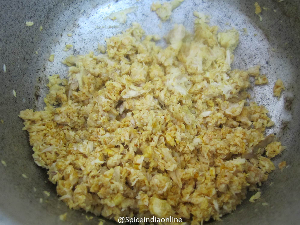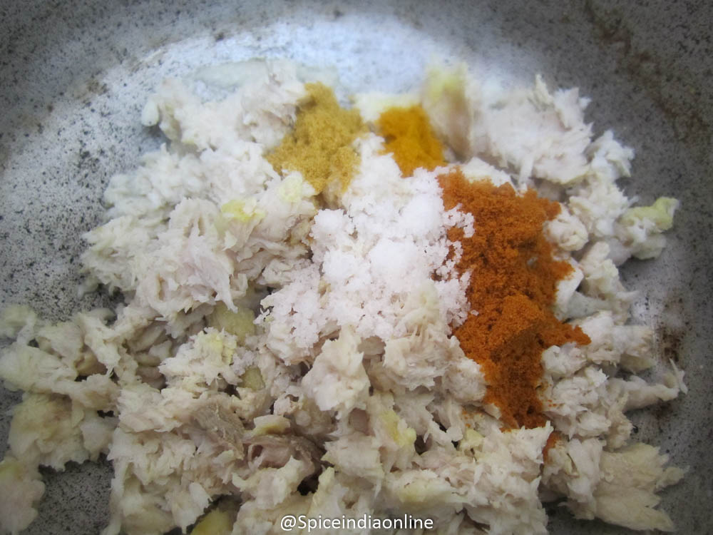 Boil in water with remaining salt and turmeric from table-2 (About 5 minutes over medium flame) Switch off and drain all the water and keep the fish pieces aside to cool a bit. Discard the bones and lightly mash and scramble the flesh.