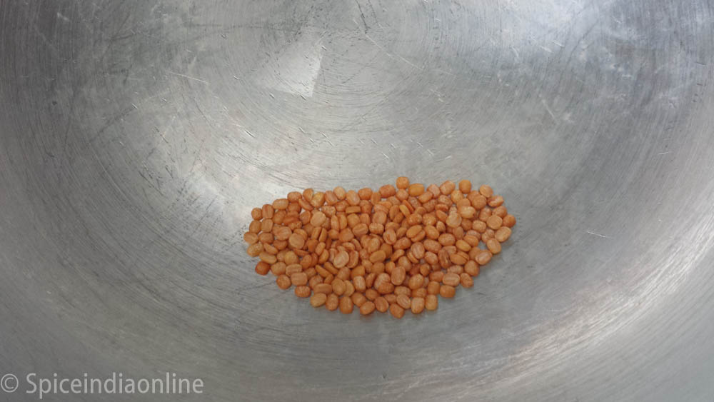 Dry roast split yellow moong dal in a kadai till becomes golden color. Use low flame while raosting.