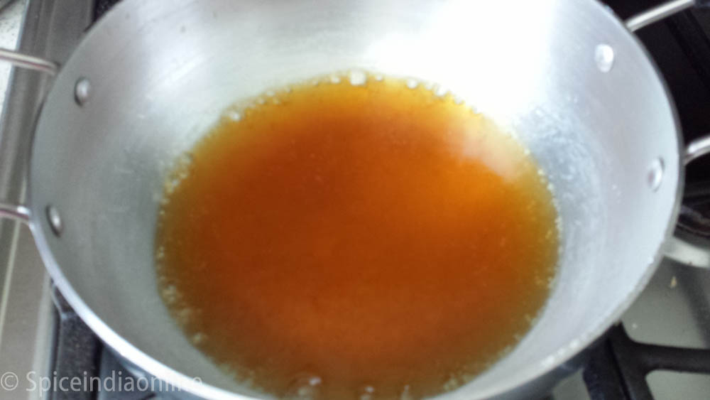 Now start melting the powdered jaggery in the given measure of water (1 cup). Make sure you melt this over low flame.