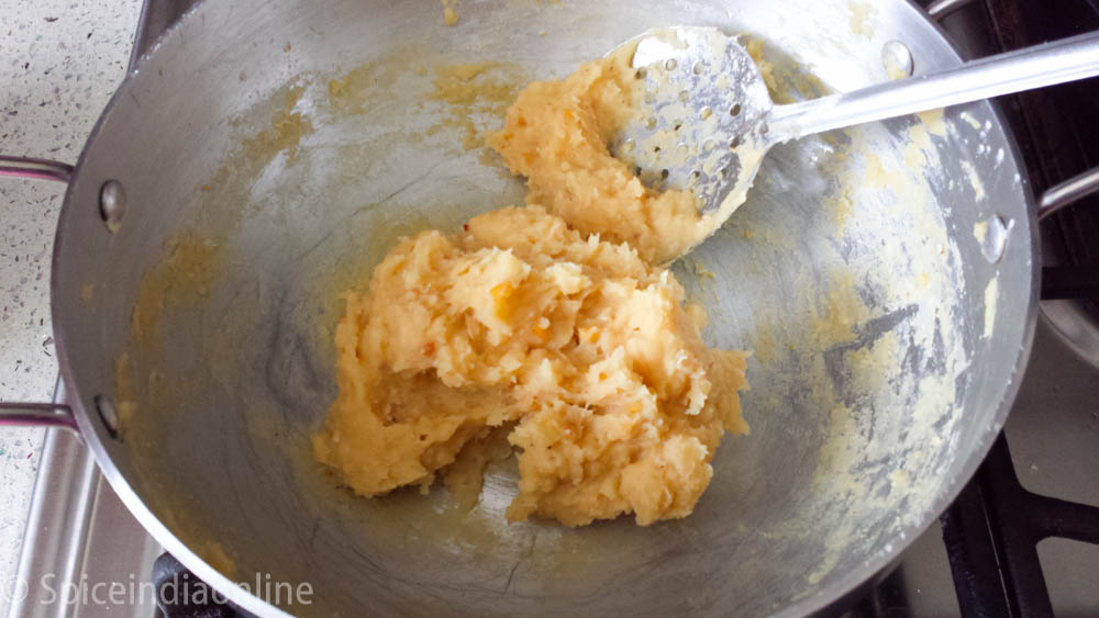 Within few minutes till will roll up to thick soft dough. Switch off at this stage.