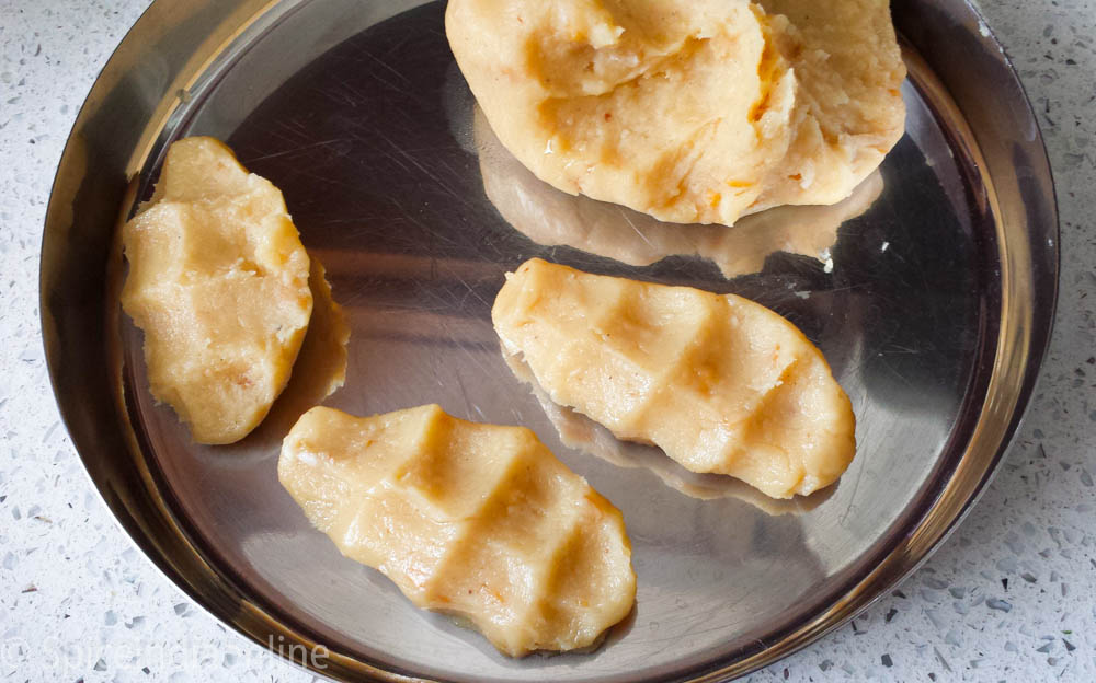 Let the dough cool a bit and while its still warm, grease your hands with ghee and shape them into dumplings as shown.  Roll them into cylindrical shape and press them with your fingers.
