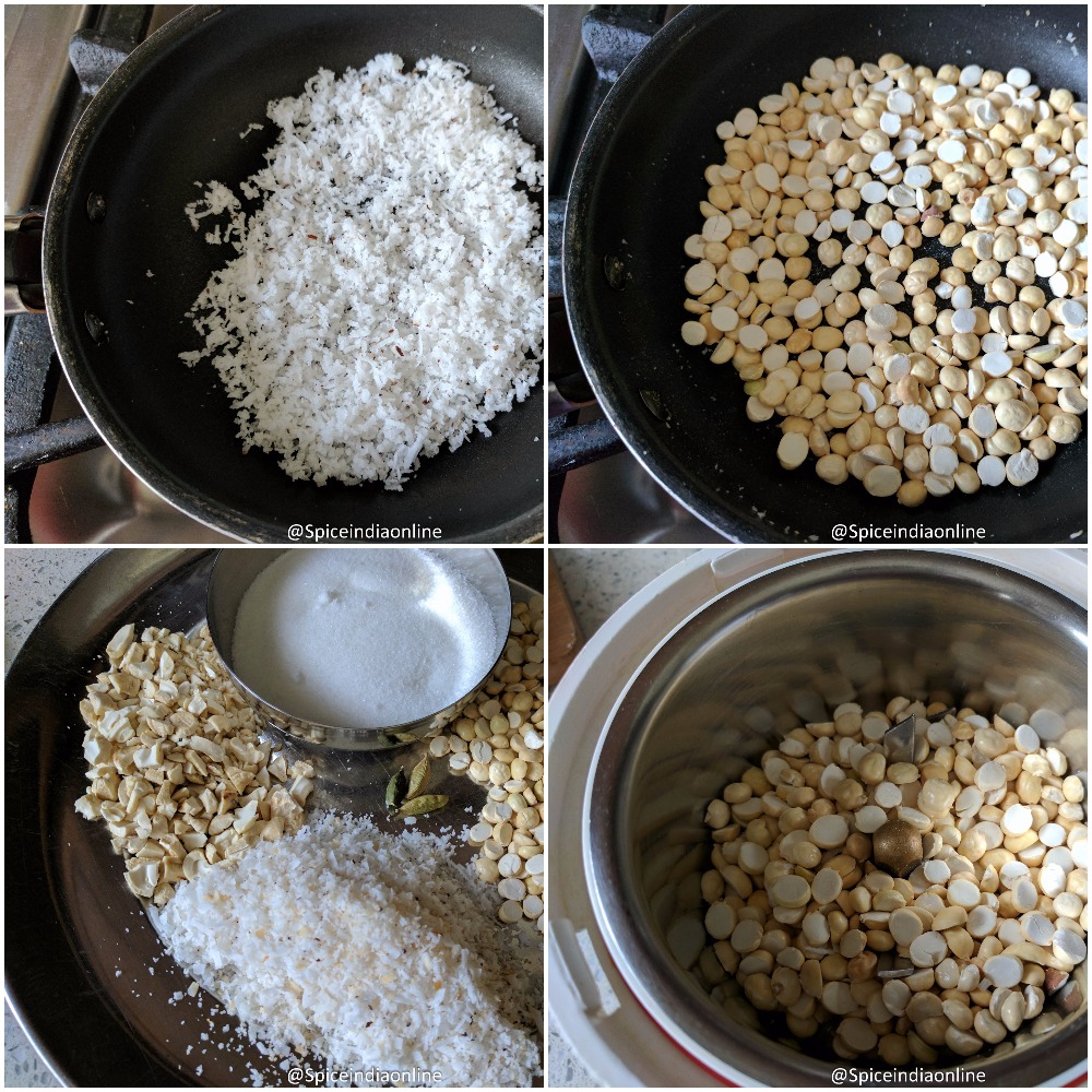 Roast coconut in 1 teaspoon ghee until they turn slightly golden and dry. (about 5 minutes over low medium flame) Once done remove and set aside to cool. Make sure you keep the flame at the lowest setting possible. Once they turn light brown, remove from pan and set aside to cool. If using dry desiccated coconut then it may turn golden very quick(within minutes) so make sure to keep the flame low to avoid browning too much. Fresh grated coconut takes about 4-5 minutes over low flame. Also lightly roast the fried grams… this is optional but it will help to keep them crisp too.
