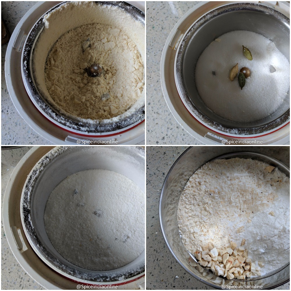 Finely chop the cashewnuts. Powder sugar and elachi in a mixie and keep aside. Combine powered sugar, roasted gram powder, roasted coconut and cashews. Filling is all ready & keep this aside.