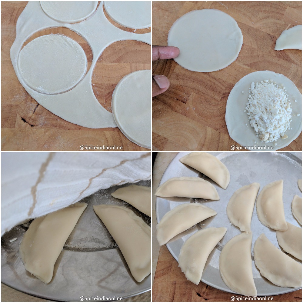 Divide the dough equally by making small dough balls. Roll out to make a thin poori. Place a little of the stuffing mix( about 2 teaspoons) in the center of the poori. Wet your finger and run it along the edges of the poori and fold into half.