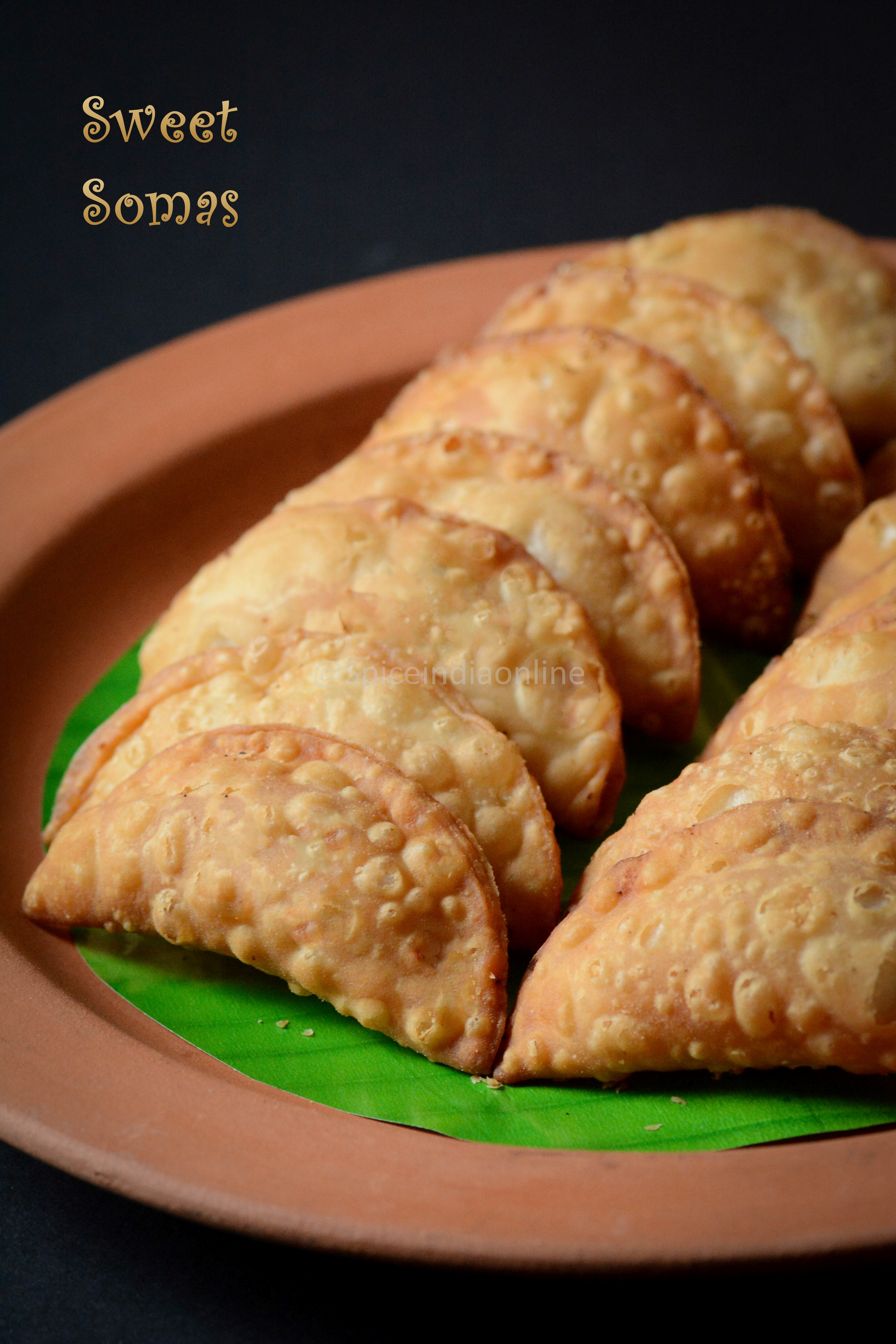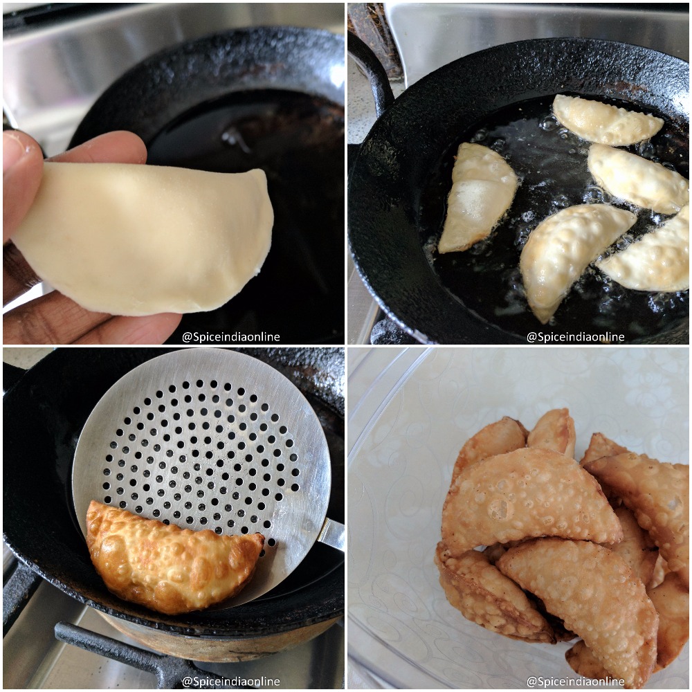 Now heat enough oil and start deep frying. The oil temperature should not be too hot, it may burn the somas, make sure its about medium hot and keep the flame between low-medium setting to fry perfectly. (Fry only 2 or 3 in one batch)Once you drop the somas in oil, it will sizzle and come up to the top. Flip once and then when both sides turn golden, remove and drain excess oil in a paper towel. Let them cool completely, then store them in air-tight container for upto 2 weeks.