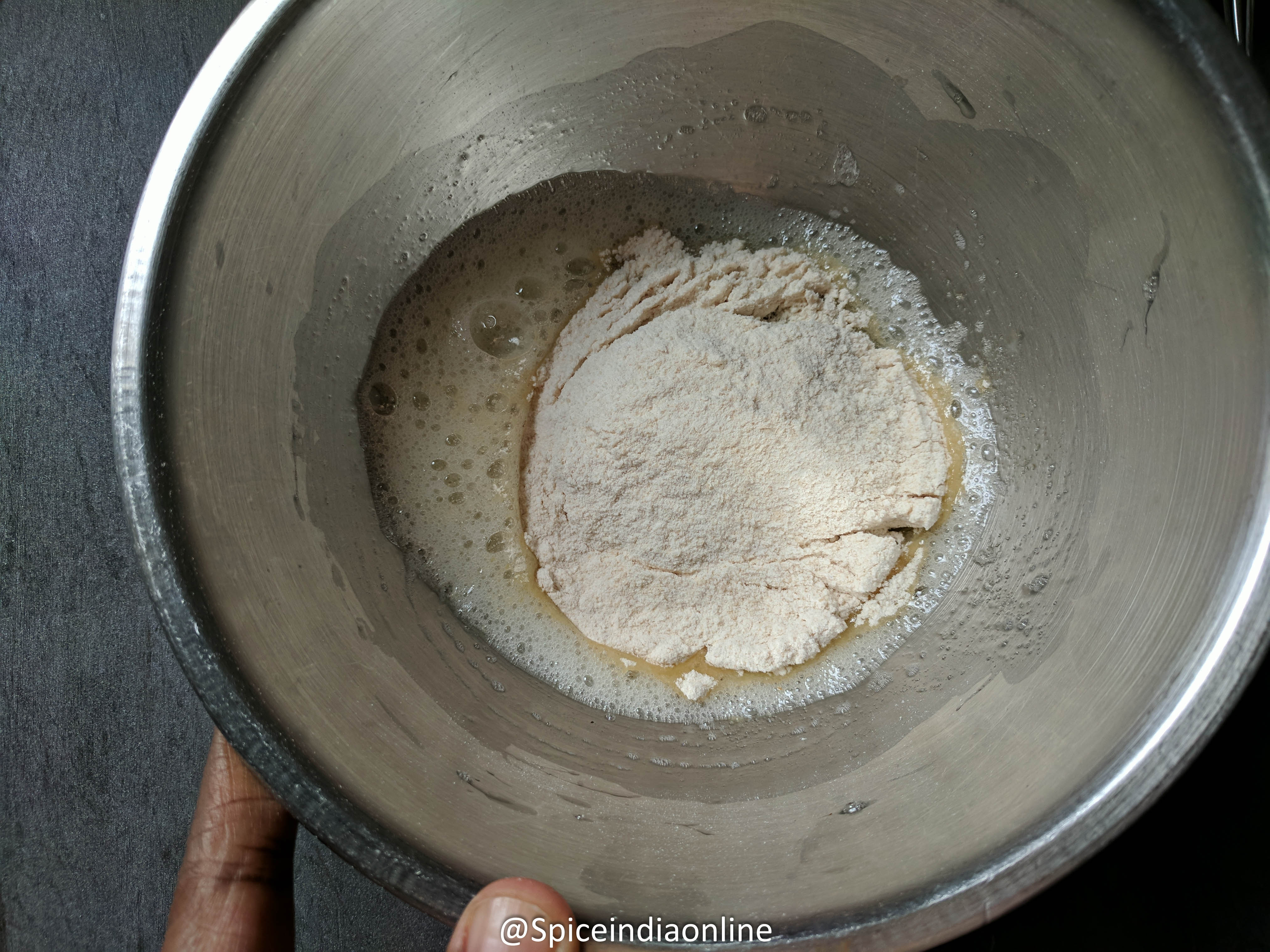 Add maida/ refined all purpose flour… and mix. Cover and refrigerate for 30 minutes to firm up.