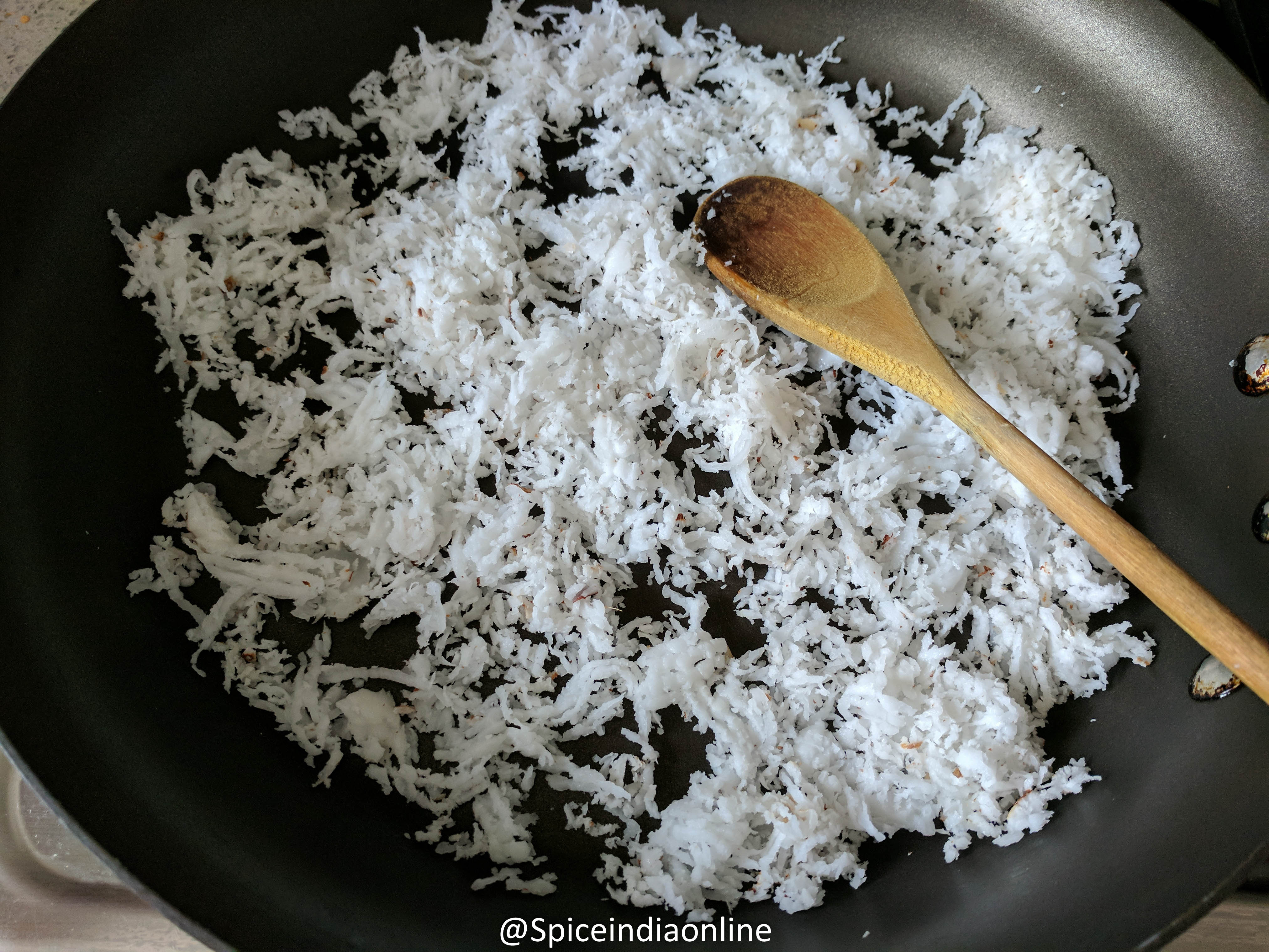 Dry fry the fresh coconut till it becomes lightly dry and golden.