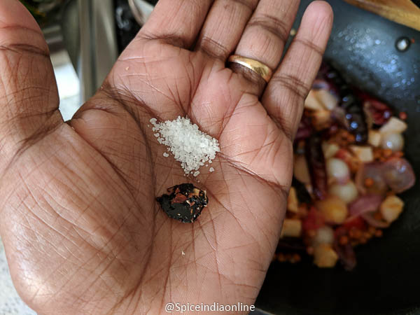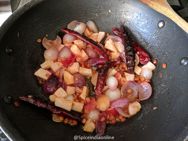 - Heat oil in a pan… first fry the bengal gram until golden and then add dry red chilli, followed by the sambar onion. Fry the onion till becomes translucent. Then add the tomatoes, tamarind & coconut and fry for few minutes.