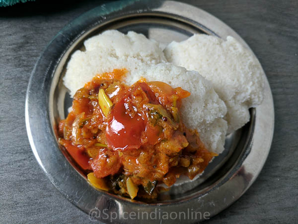 Gothsu” refers to a chunky style gravy… almost like a light version of salsa which can be made in quickly to feed a crowd. Today’s recipe is all about Tomato Onion Gothsu…most South Indian gotsu recipes include a hint of dal and made without ginger garlic and even sometimes without onion… a typical Brahmin style recipe.