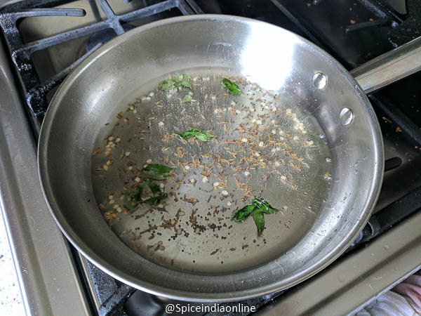 Heat oil in a kadai, temper with mustard seeds, split black gram, cumin seeds and curry leaves. Sprinkle the asafoetida.