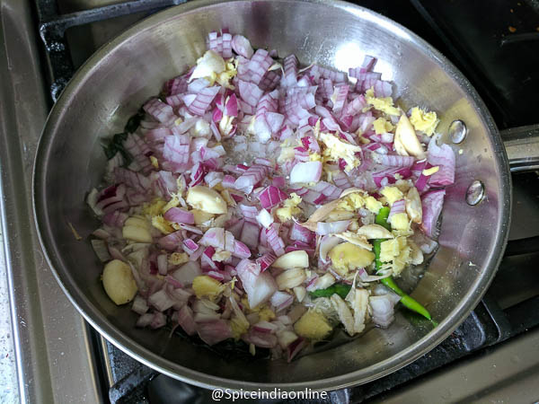 Add in green chilies, onion, crushed ginger and garlic. Saute till the onion turn translucent.