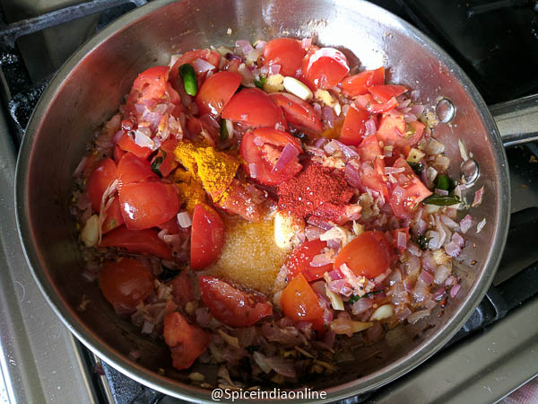 Add in turmeric powder, red chili powder, sugar and salt. (sugar adds nice touch to the tangy tomatoes making it slightly sweet)