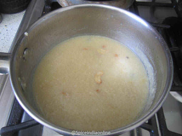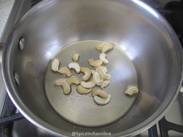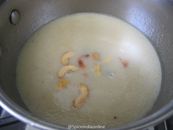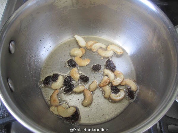 Heat ghee in a heavy bottomed pan, roast cashews and raisins till they turn golden.