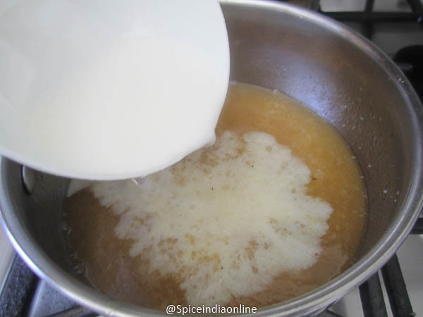 At this stage, reduce the flame to low and add in the thick coconut milk. Stir for few minutes over low flame to thicken to desired consistency.