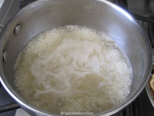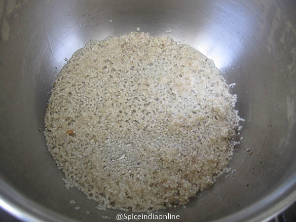 In the same pan, roast the varagu arisi in the ghee just to toast a bit. (You need to wash the varagu arisi in water and drain to remove dirt)
