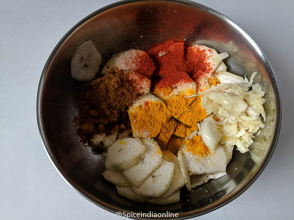 Sprinkle little water to make the masala coat to the raw banana. (that ginger garlic will help to hold the masala plus if you wish you may add a sprinkle of gram flour or corn flour to make the masala stick to the veggie, not really necessary unless you wan it)