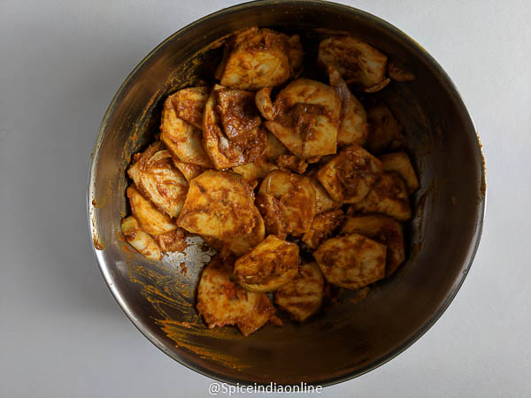 Take those in bowl, mix turmeric powder, chilli, coriander powder, salt, crushed ginger, garlic and salt.