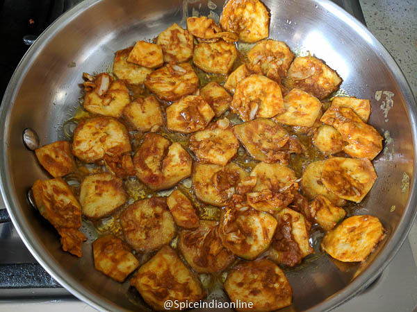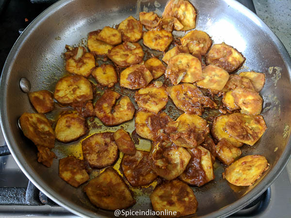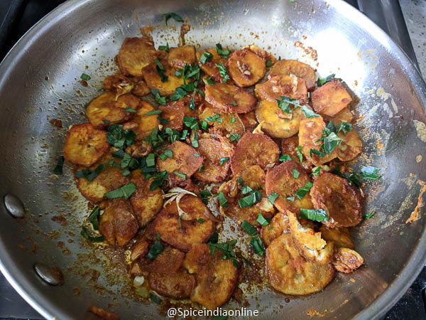 Do not disturb by scrapping the pan while its still cooking… this may separate the masala from the raw banana. Let it cook until it browns on one side, then slowly flip to the other side and cook again until it browns.