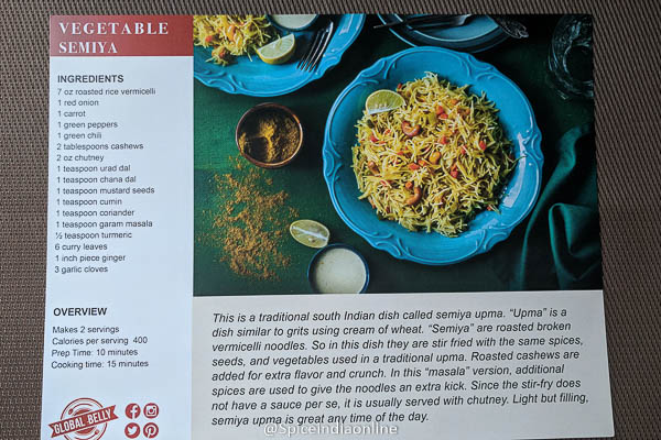Vegetable Semiya – Broken Vermicelli noodles stir fried with vegetables and spices. All ingredients sent fresh from GLOBAL BELLY , a meal kit company which offers a convenient way to try new dishes at home with all the fresh ingredients delivered to your door step. They offer multiple cuisine meal kits to try and you don’t have to worry about shopping for hard to find ingredients. It also comes with a recipe card which walks you through the entire preparation which is quite easy to follow with perfect portions. They offer one time orders & subscriptions which are quite flexible with both veg and non veg options.
