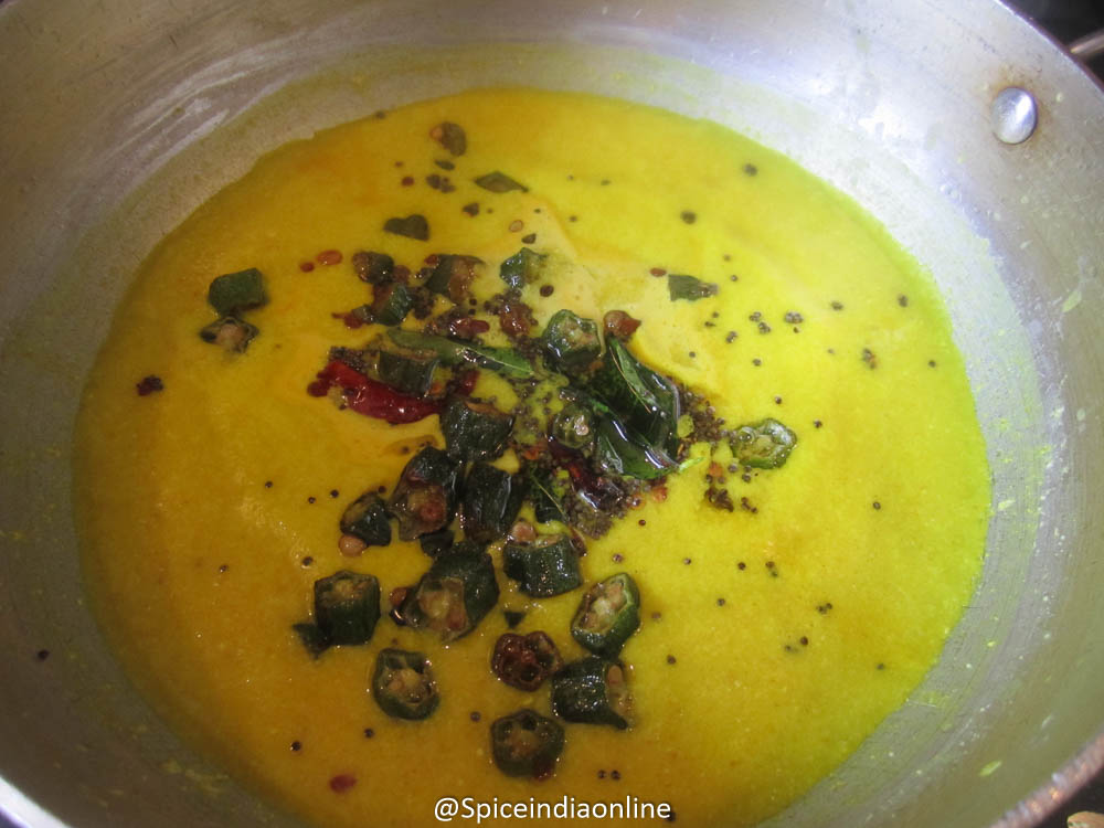 Heat coconut oil and splutter mustard seeds, dry red chili, curry leaves and asafoetida. Add this the curry along with the sauteed ladys finger. Mix it and serve with choice of curry and rice.