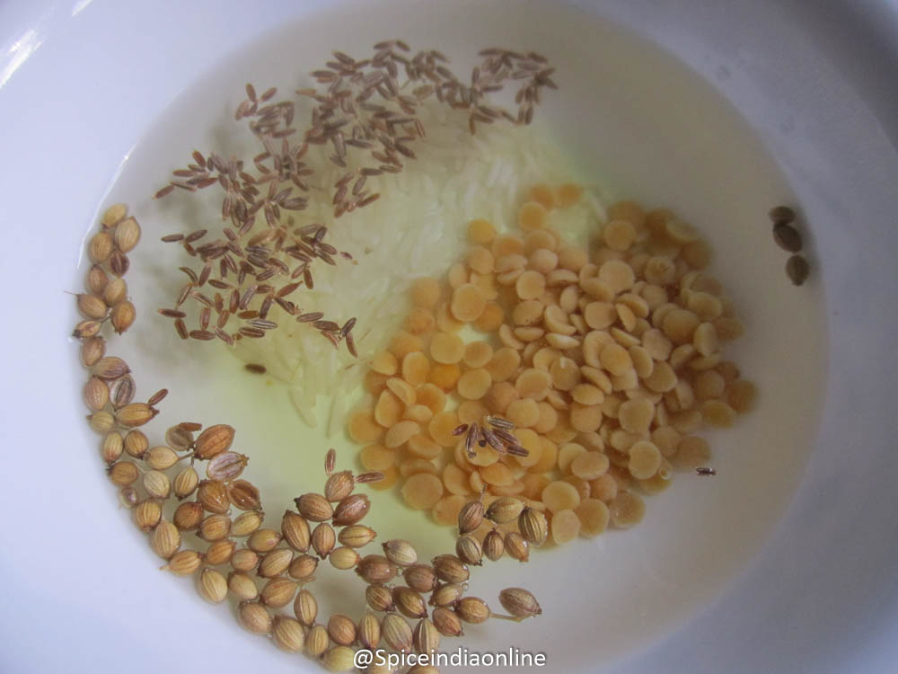 Soak Toor dal, coriander seeds, raw rice and cumin seeds for 1/2 hour in little warm water.