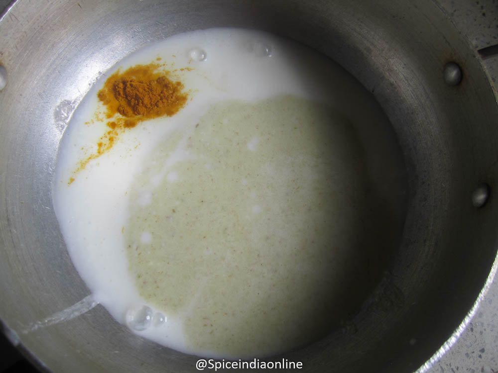 Add in turmeric powder and ground paste and salt. Give a quick stir.