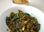Wash and cut Vendakkai into 1 " pieces and set aside. Heat just 3 tsp of oil in a wide frying pan and shallow fry the Vendakkai pieces until they turn light brown. Do not cook them till death, fry until they are just tender on the inside and crispy on the outside. Remove them from pan and keep aside. Now in the same pan add the remaining oil and splutter mustard, cumin seeds, split black gram and curry leaves. Fry chopped onions and garlic for few minutes and add the shallow fried vendakkai to this along with turmeric powder, Idli milagi podi and salt. Fry until everything blends to form a dry mixture, takes about 3 to 4 minutes on low flame. Switch off serve hot with curd rice.
