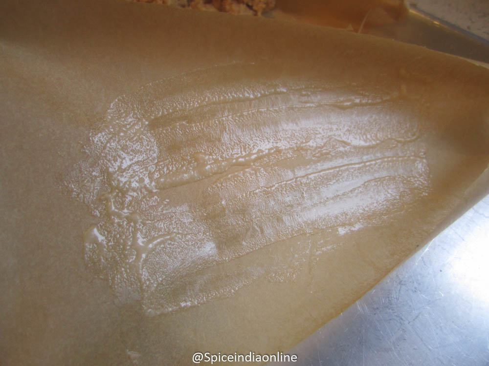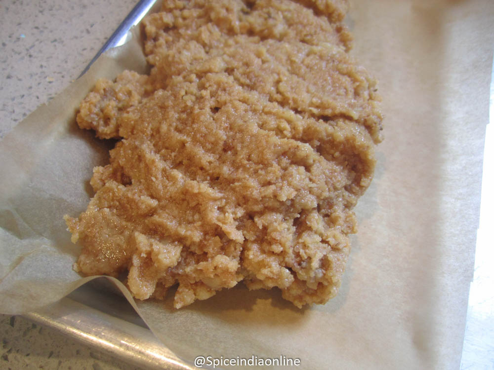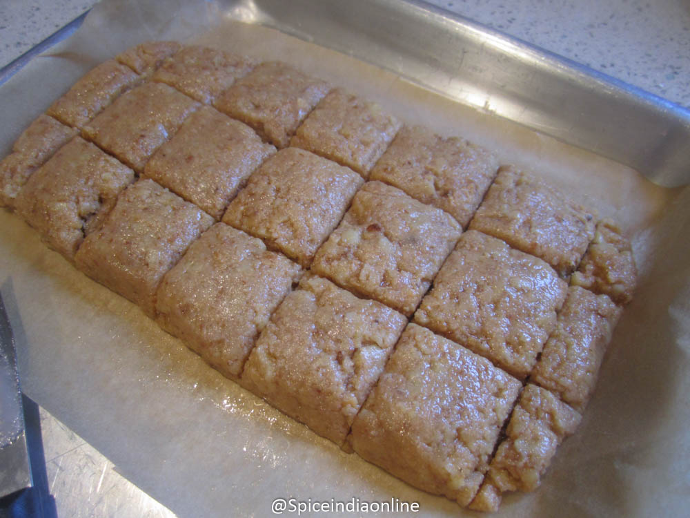Grease a tray or parchment/butter paper and transfer the halwa. Also grease another butter paper and place it over the halwa and press. Even it out and press tight in the greased sheet. You may also shape them into small laddus if you don’t wish to cut them into little squares. Greasing with ghee helps as the halwa is very sticky.