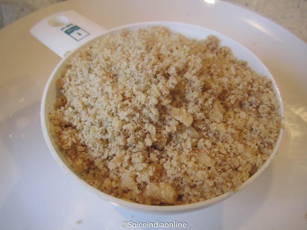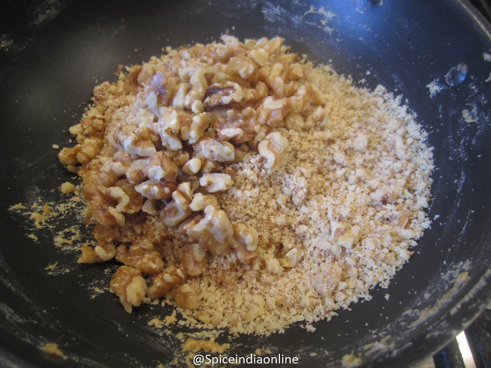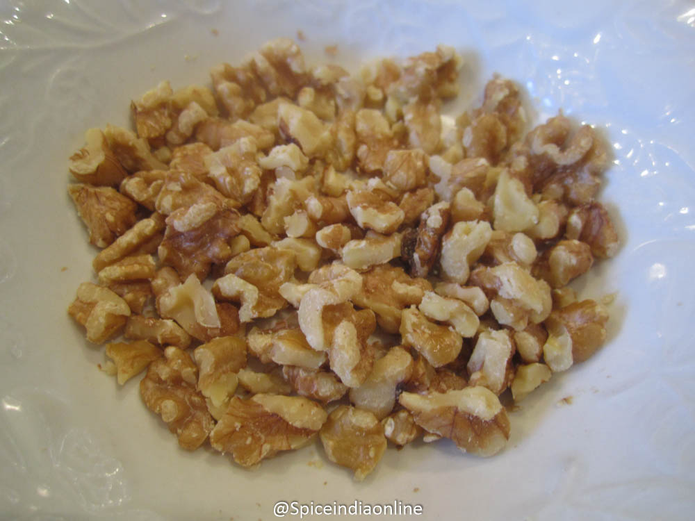 Spread walnuts in a microwave safe plate and toast about a minute in high power. Alternately you may roast them in an iron skillet or pan for few minutes to brisk them up a bit. Let them cool down completely before you grind.Roughly chop 1/4 cup or one fistful of nuts and keep aside. Grind the rest into a coarse powder form.