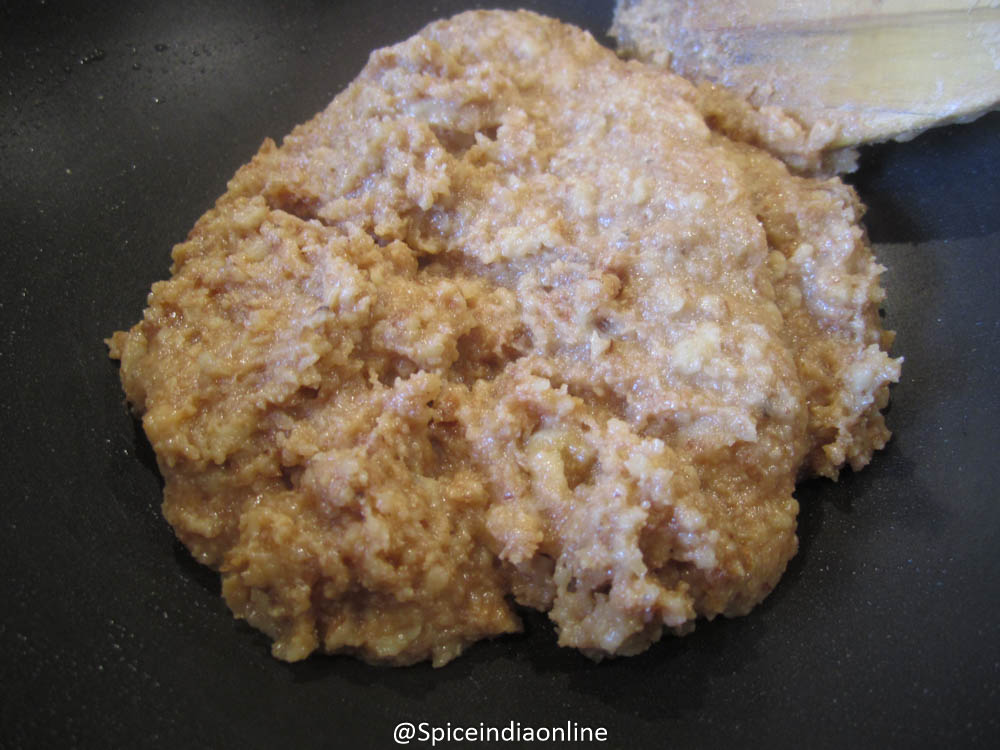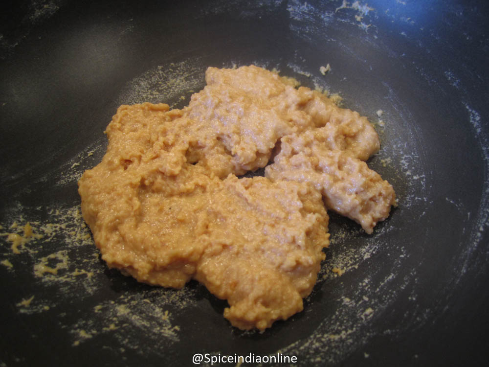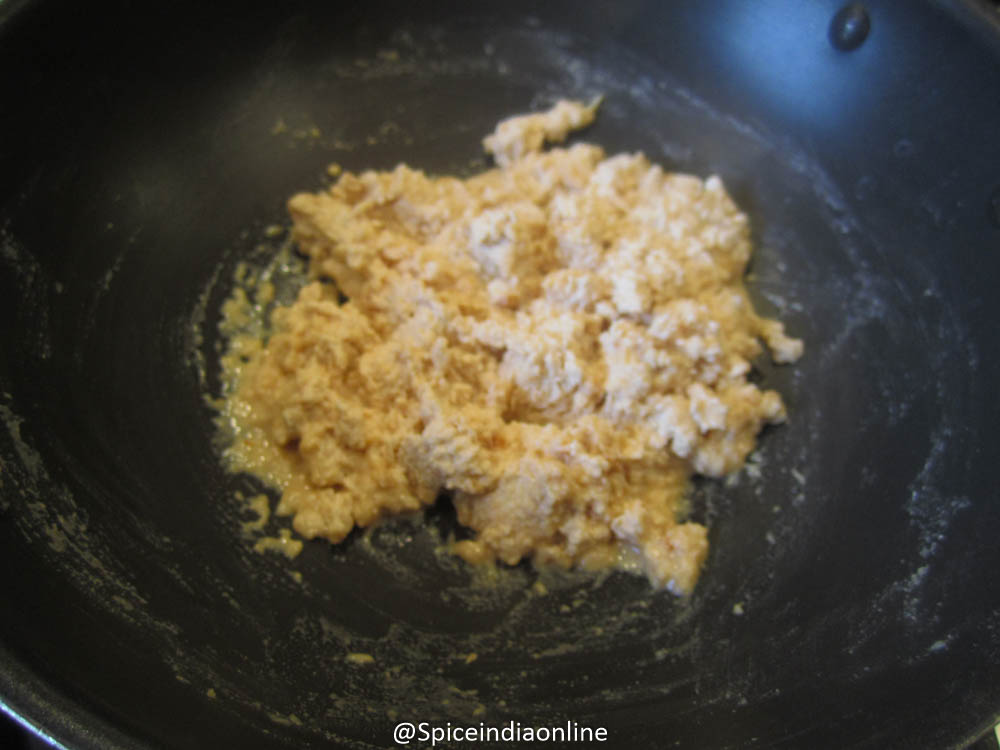You may use store bought khoya but it taste good with fresh homemade soft khoya- clink on this link to refer Khoya/ Mawa recipe. In a pan add the soft khoya and fry until it turns slightly dry and golden.