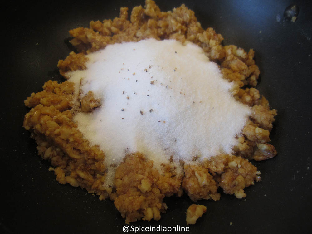 Now add powdered and chopped walnuts to the khoya. Fry for few minutes over low flame until everything well combined. Add the sugar, which will melt when comes in contact with the khoya nut mixture. Add powdered cardamom at this stage.