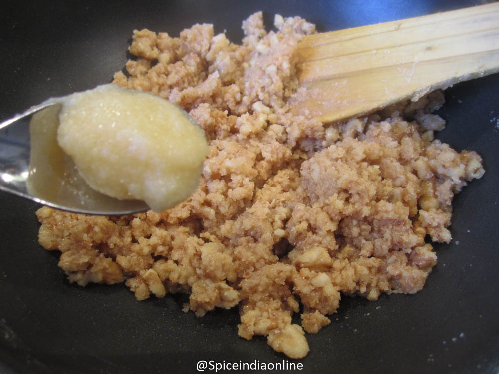 When the sugar melts it will make the mixture very gooey… more like a wet halwa consistency. Mix thoroughly and keep stirring until, the walnut-khoya mixture leaves the sides of the pan. (10-12 minutes over low medium flame) It has to be on the dry side and come to together as one big lump. Add ghee at this stage little by little and switch off.